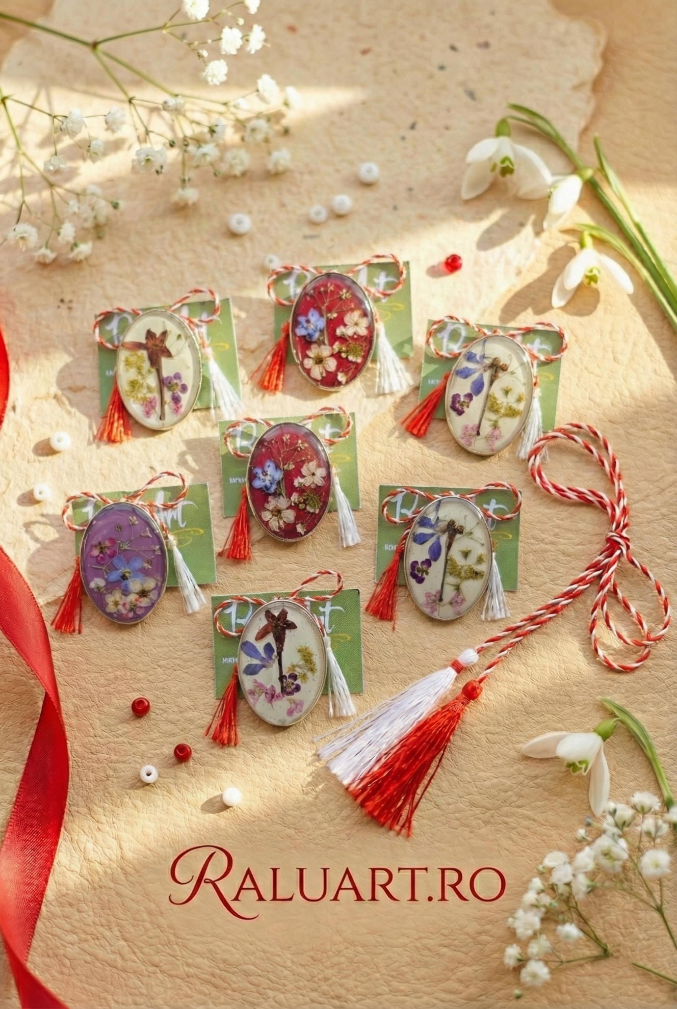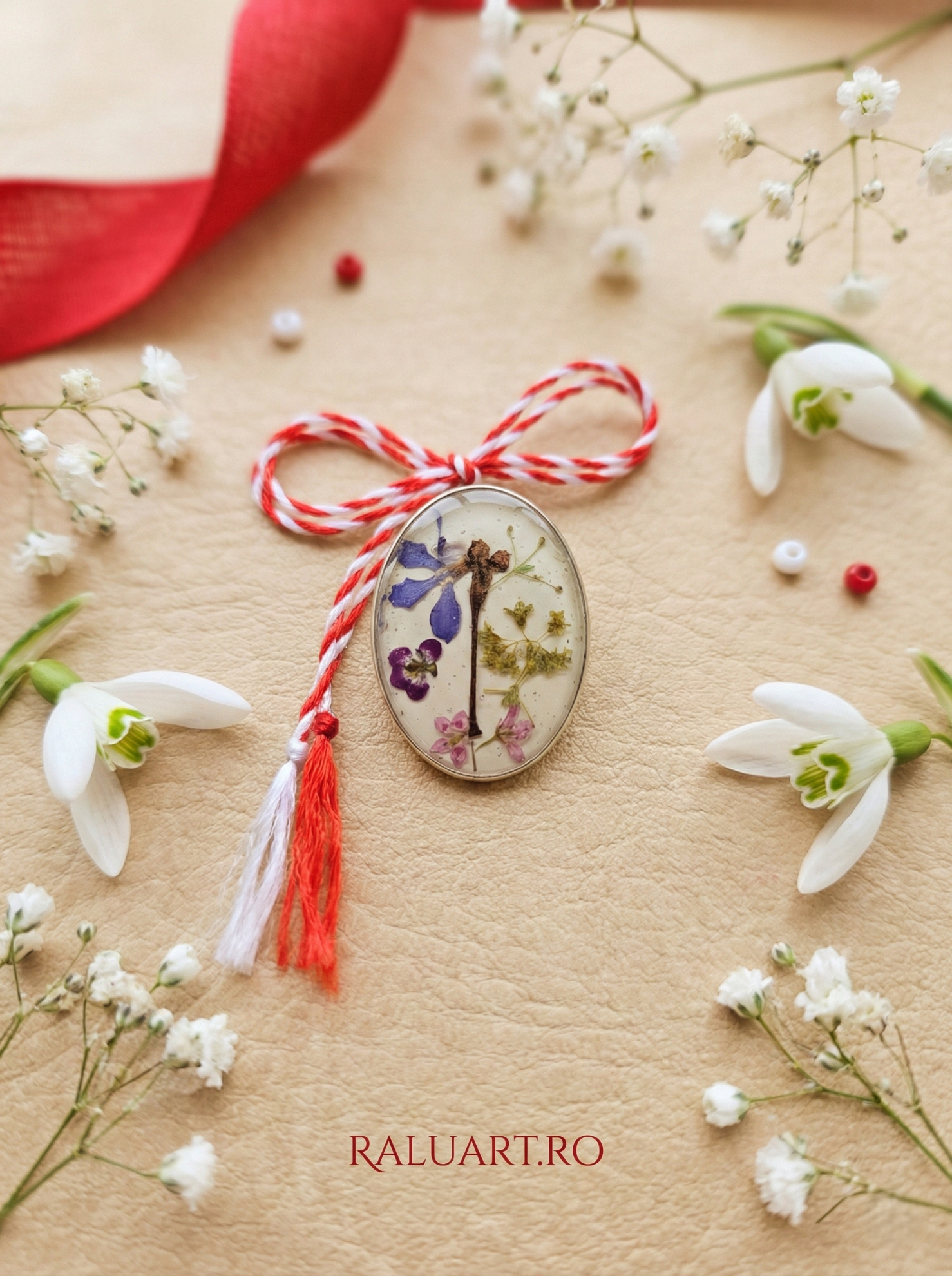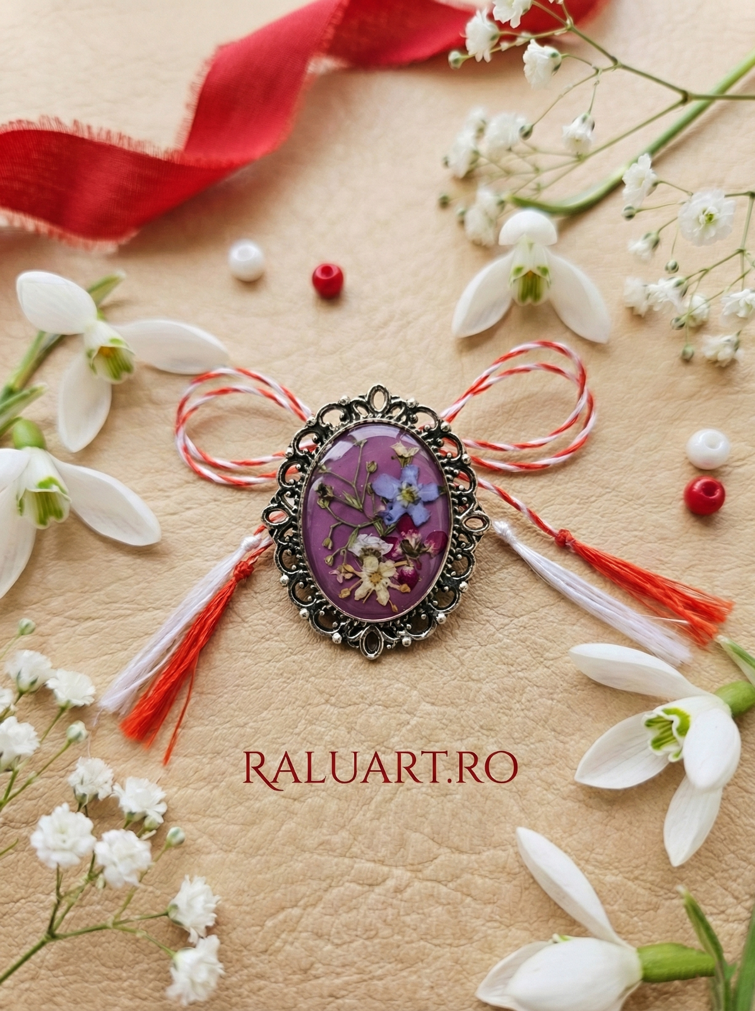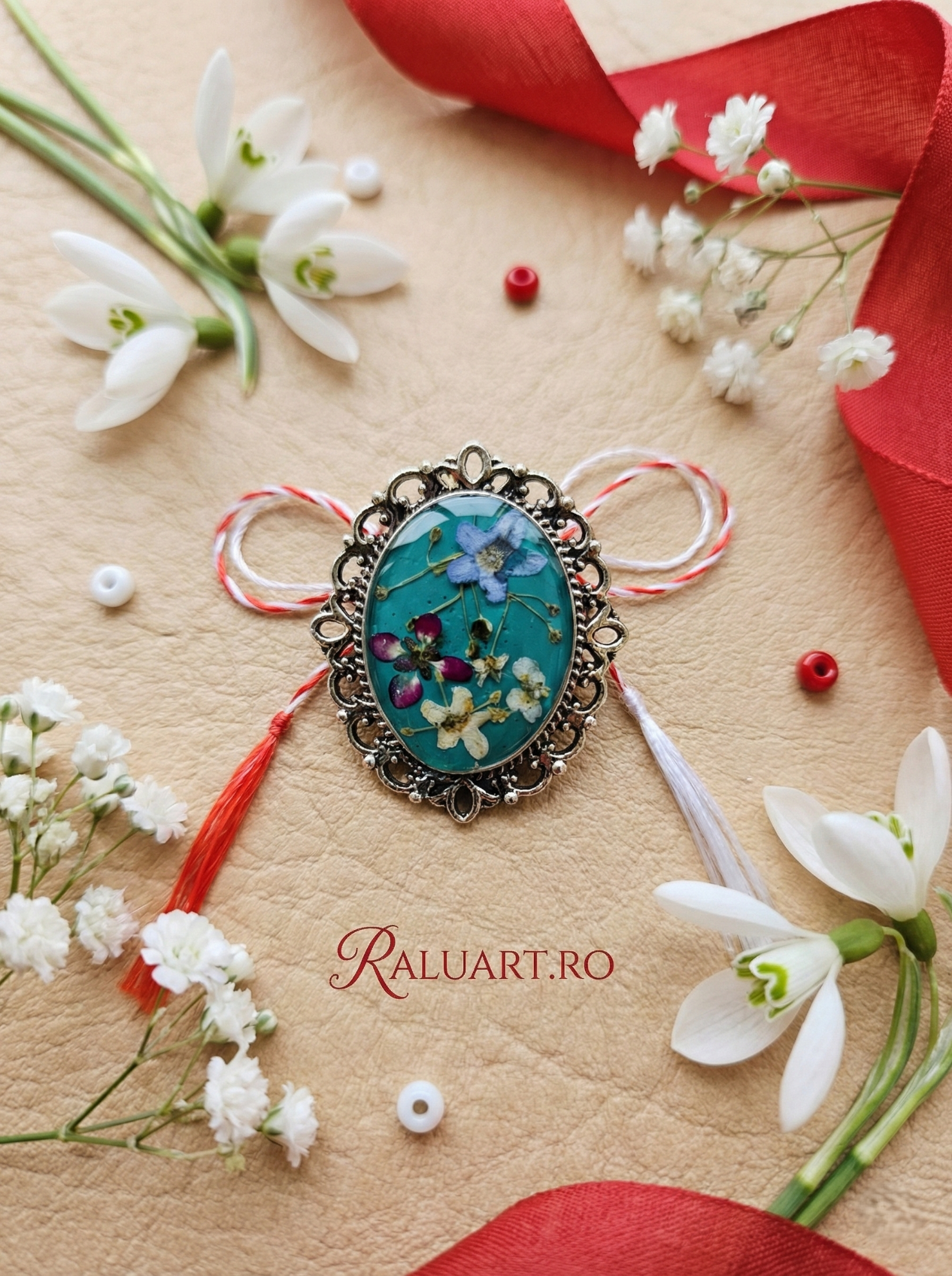 Bază Metalică Solidă: Rama oferă protecție și structură, transformând mărțișorul într-o bijuterie statement care se fixează perfect pe haine.