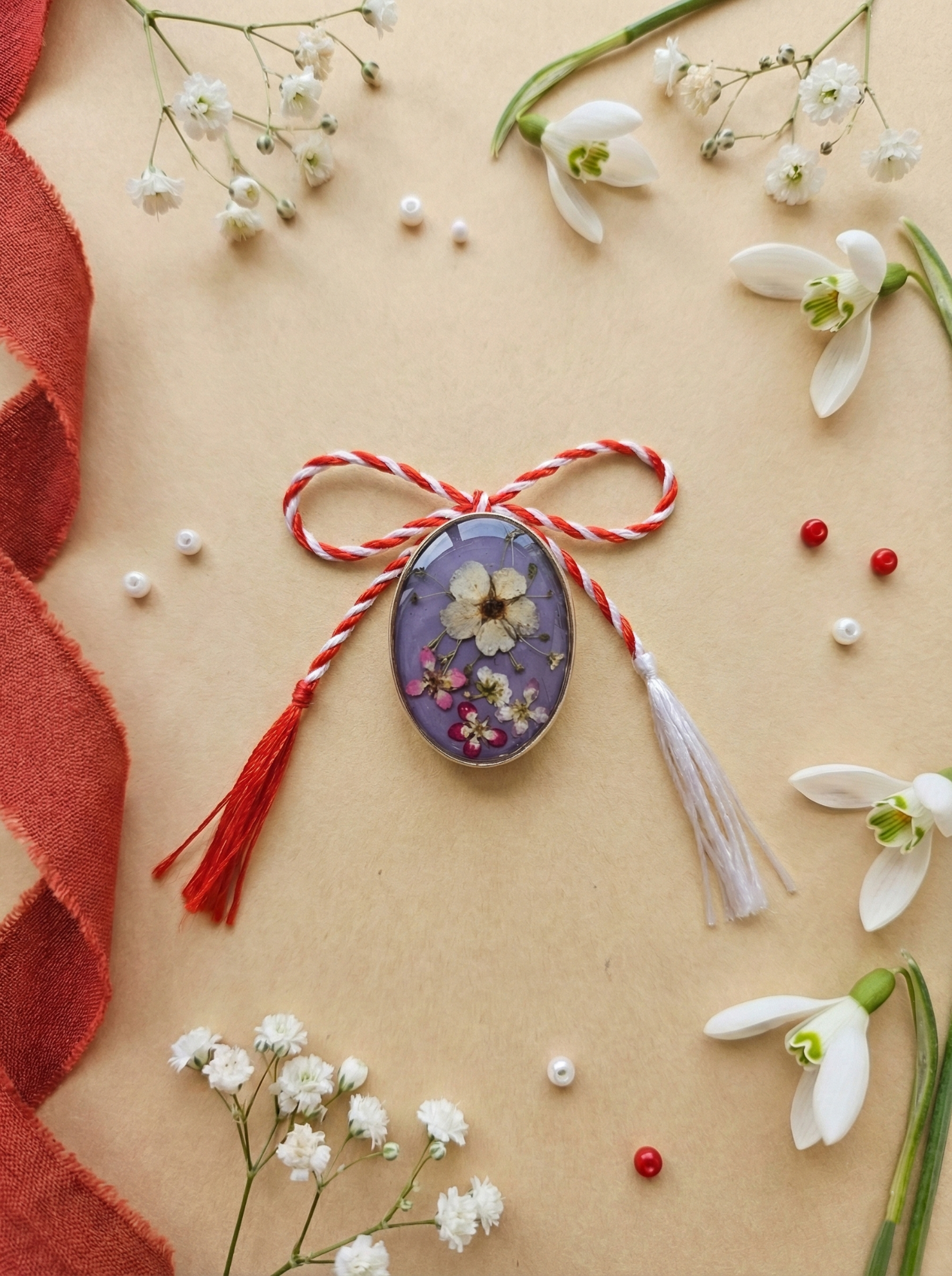 Această broșă este o piesă de bijuterie fină, creată pentru a aduce un plus de rafinament oricărei ținute. Pe o bază metalică rezistentă, am așezat cu grijă flori naturale presate, pe care le-am sigilat sub un strat de rășină transparentă. Rezultatul este un accesoriu care îmbină durabilitatea metalului cu delicatețea naturii, fiind un mărțișor deosebit care poate fi purtat ani la rând.