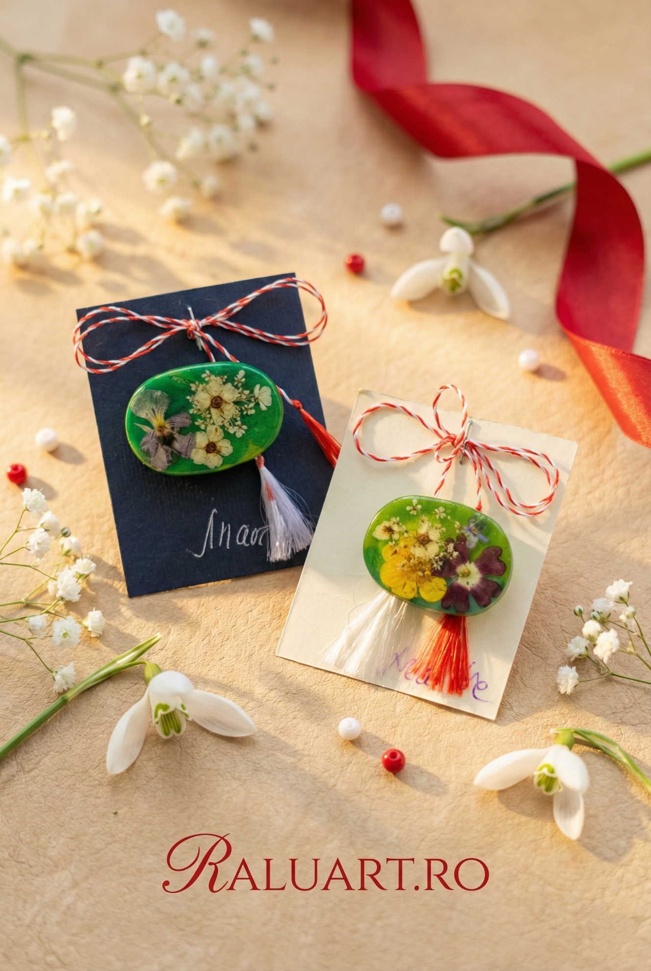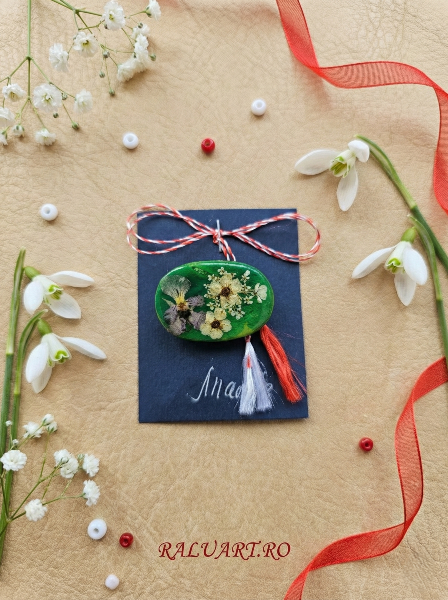 Ambalare: Vine montată pe un suport elegant, însoțită de șnurul de mărțișor alb-roșu, gata pentru a fi oferită cu drag.