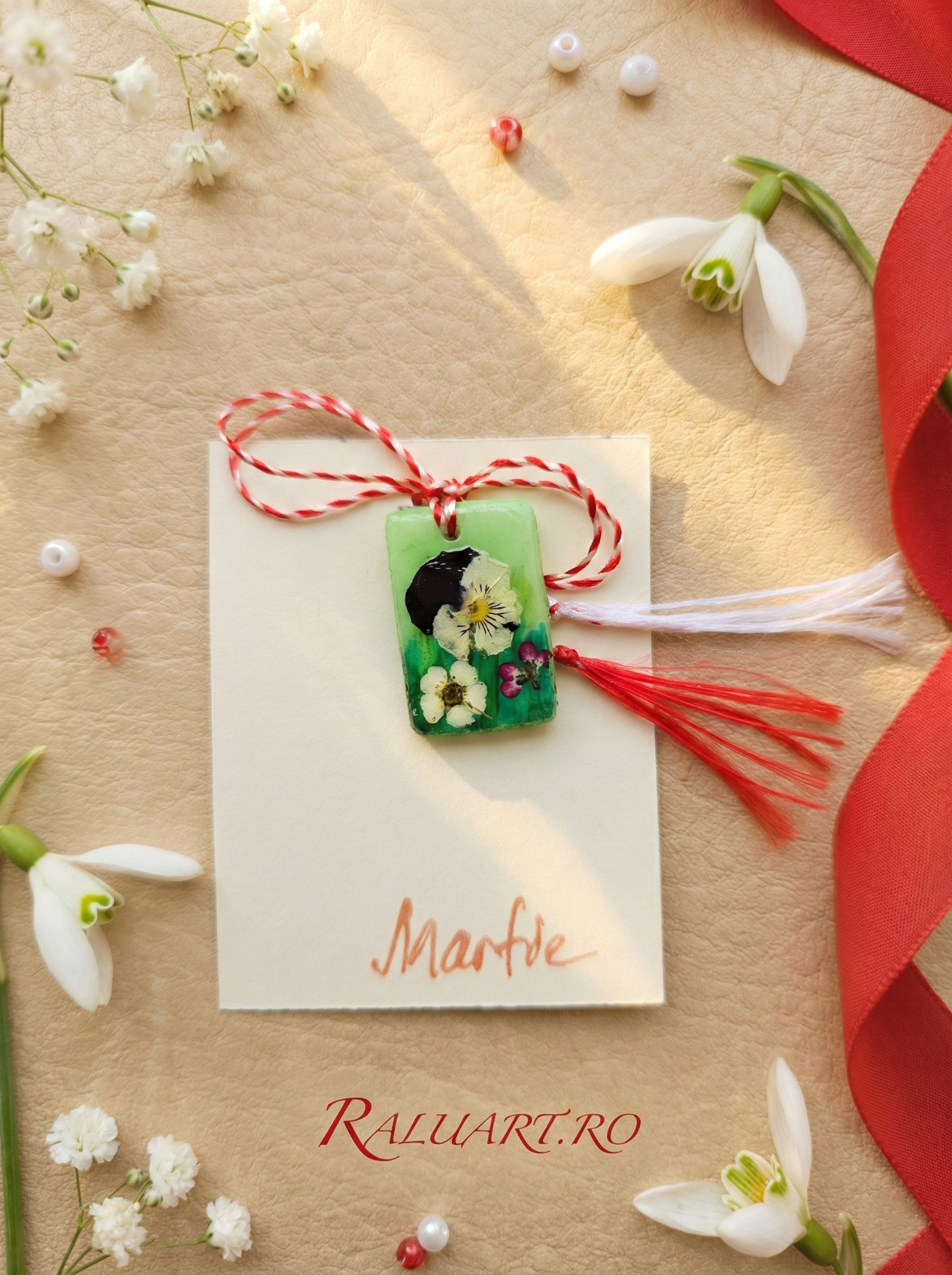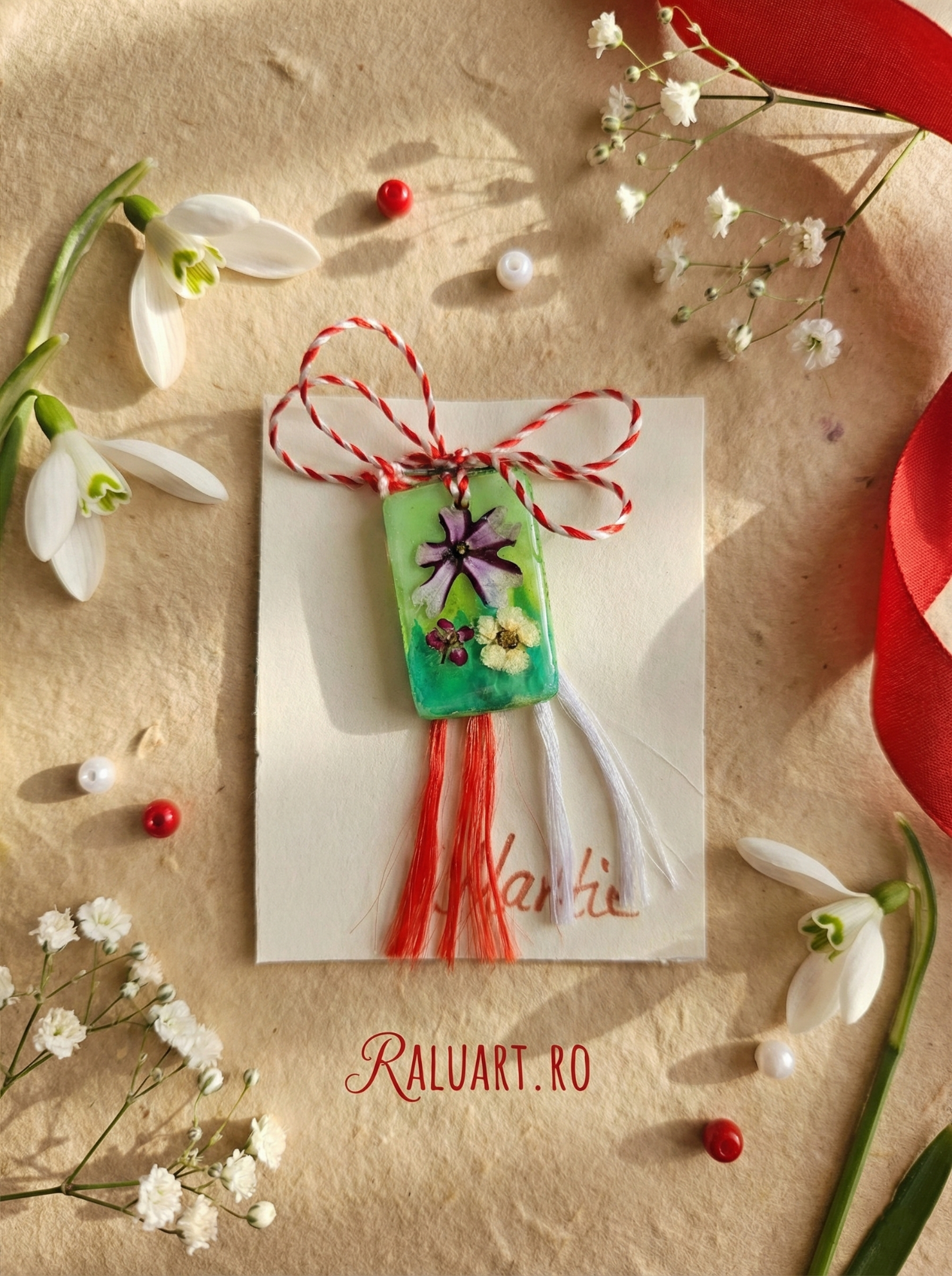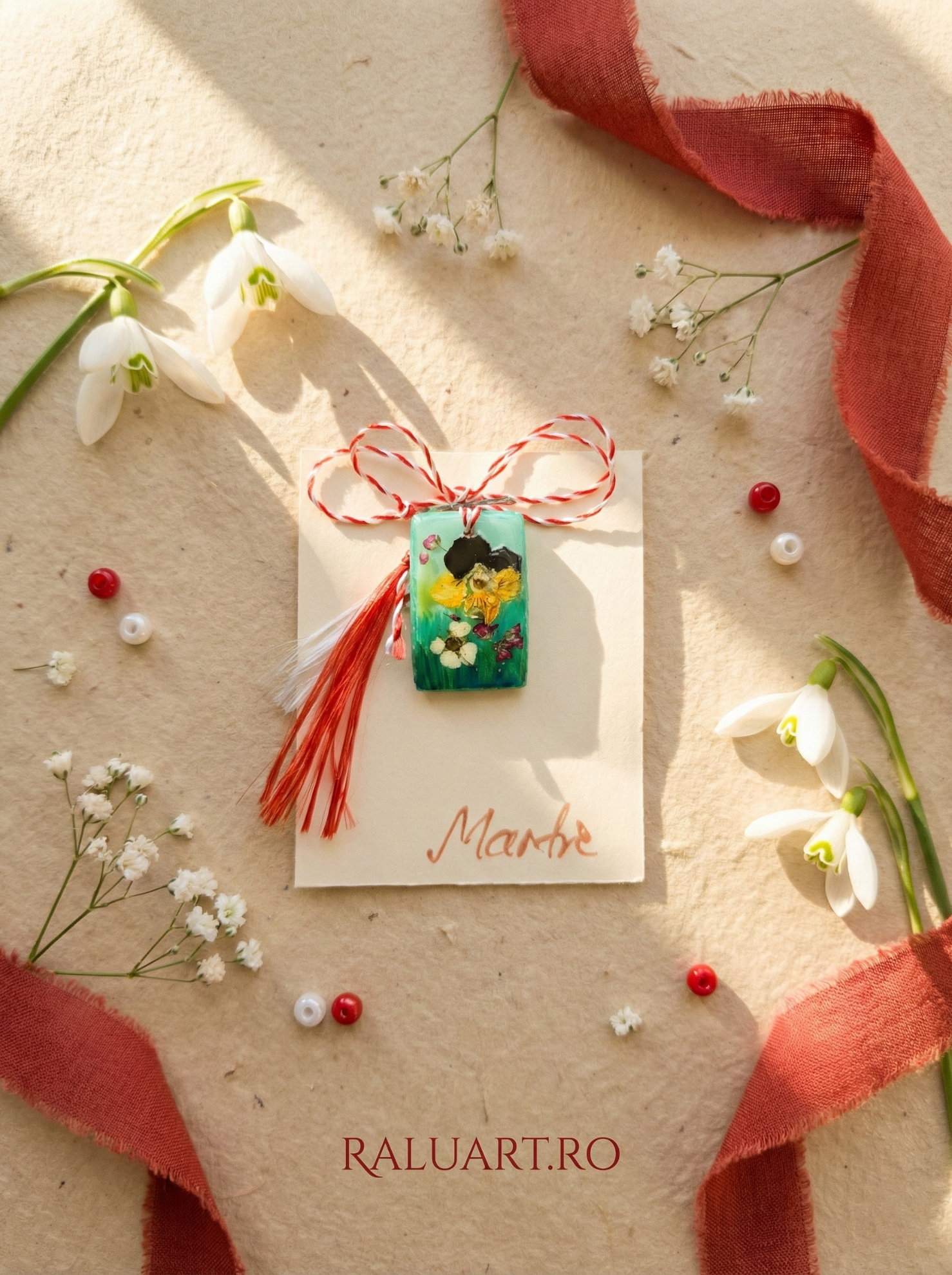 Ambalare: Vine montat pe un suport de carton elegant, gata pregătit cu șnurul tradițional alb-roșu.
